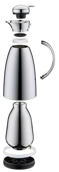In der Thermoskanne Gusto werden dank des alfiDur Vakuum-Hartglaseinsatzes Kaffee und Tee bis zu 12 Stunden heiß gehalten. Über die praktische Einhandbedienung und dem intelligenten Air Control Belüftungssystem können die Getränke punktgenau ausgegossen werden. Für eine unkomplizierte, hygienische Reinigung ist der Deckel ist leicht zerlegbar. Zudem macht die Isolierkanne auf jeder Tafel eine gute Figur: Mit wohltuend sanften Übergängen vom Ausgießer bis in den glänzenden Korpus mit verchromtem Griff. Entwickelt in Deutschland.