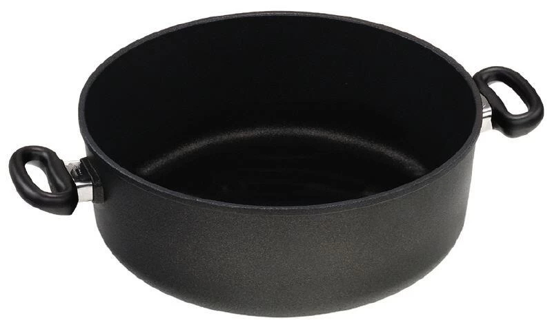 Über eine fettreiche Kost brauchen Sie sich mit dem Kochgeschirr aus Aluminium-Handguss von AMT keine Gedanken mehr zu machen. Sie können in diesen Pfannen enorm fettreduziert und sogar fettfrei kochen und braten! Der bis zu 10 mm starke Boden nimmt die Ofen- bzw. Herdwärme besonders gut auf und speichert sie extrem lange. Diese herausragende Wärmespeicherfähigkeit spart Energie und schont die Umwelt. Die Oberfläche ist mit einer Spezial-Antihaft-Versiegelung versehen, die ein Anhaften des Bratguts verhindert und spielend leicht zu reinigen ist. Zeigt sich auf der Bratfläche eine leichte Bräunung, ist sie eingebraten. Die leichte Verfärbung ist eine natürliche Patina und vollkommen normal. Sie verhindert das Anhaften der Speisen. Entfernen Sie die Patina niemals mit Stahlwolle oder Scheuermittel.
