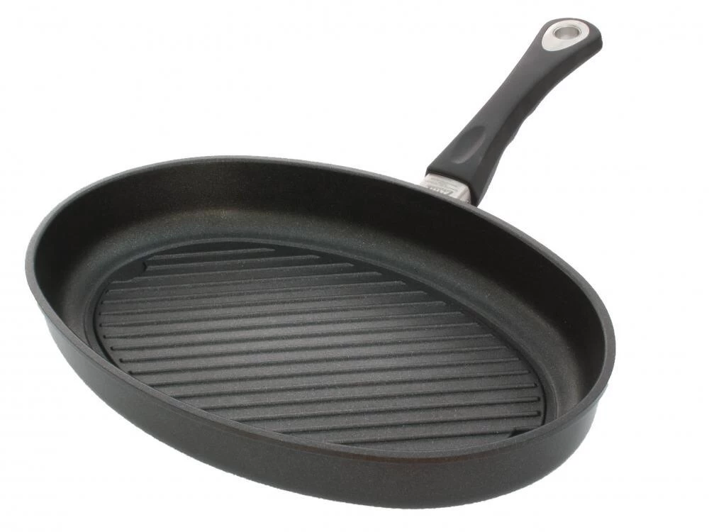 Fischpfanne aus Aluguss mit Grillboden, Saft- und Fettrinne sowie zwei Auffangmulden für Induktion. Die ideale Pfanne für die fettarme und knusprige Art der Fischzubereitung. Das Werkzeug der Deutschen Köche-Nationalmannschaft.