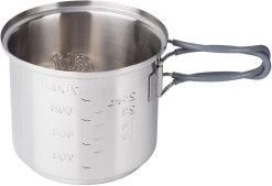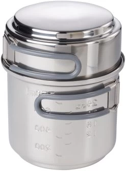 Es besteht aus zwei hochwertigen Edelstahl-Töpfen, dem Stand mit Brenner und einem praktischen Netzbeutel für den Transport. Der größere Topf hat eine ml-/ oz-Skala und fasst ca. 985 ml, der kleinere, der zugleich Deckel des größeren ist, 470 ml.