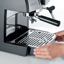 GRAEF Espressoautomaten sie beherrschen, geht auf das Jahr 1901 zurück. 6 bis 8 Gramm fein gemahlenes Kaffeepulver werden unter hohem Druck (9 bar) in ca. 23 Sekunden in der Maschine extrahiert. Das Wasser hat dabei eine Temperatur von 89-96°C. Bei Espressoautomaten wird das Kaffeepulver von Hand in das herausnehmbare Sieb gefüllt und gepresst, ein Vorgang, der als „Tampen“ bezeichnet wird.