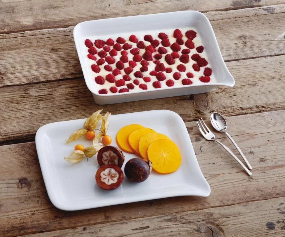 Zum Backen und Dünsten im Ofen gibt es die Kahla Backformen Five Senses. Bei allen Gefäßen ist eine Ecke so geformt, dass sich überschüssige Flüssigkeit abgießen und Sauce ausgießen lässt.