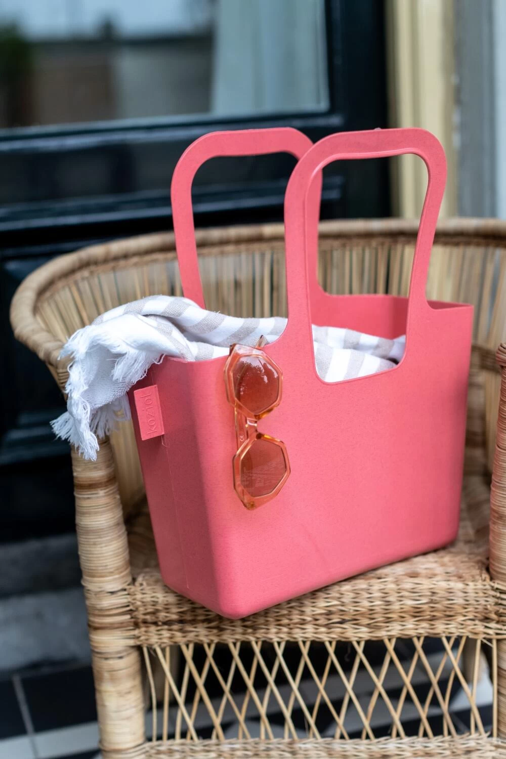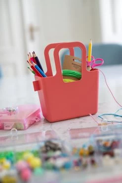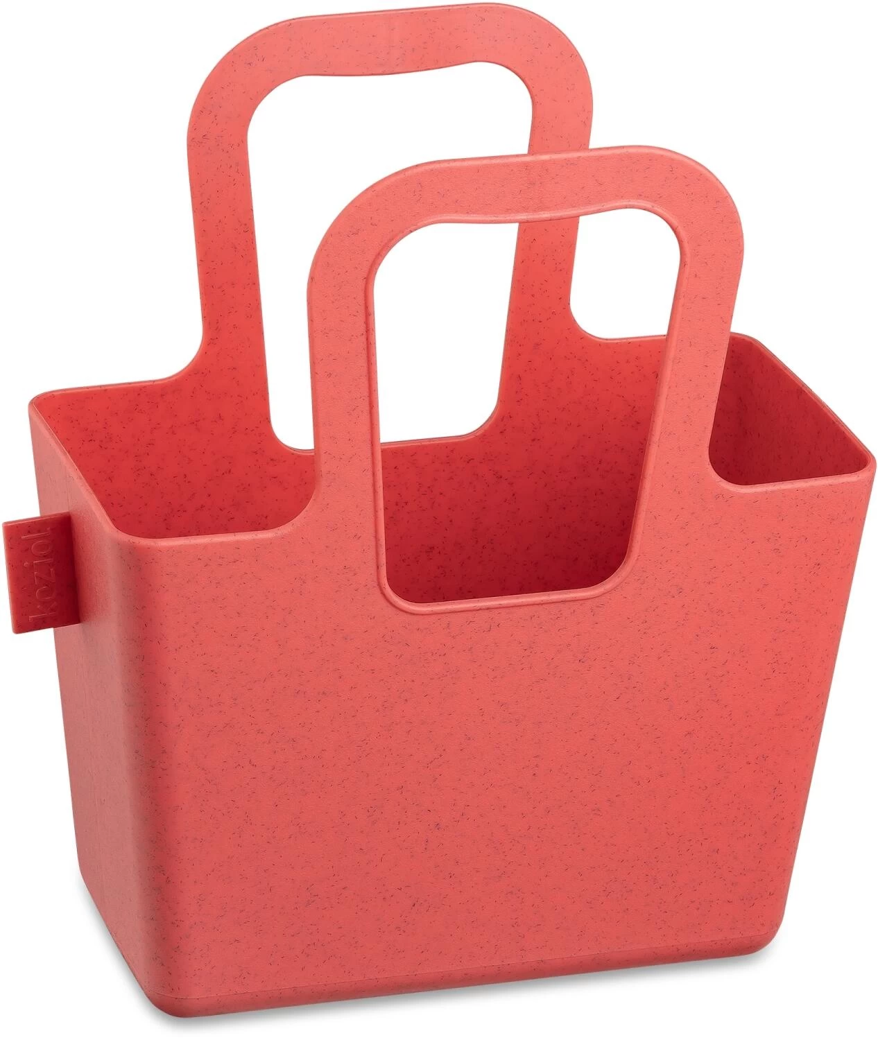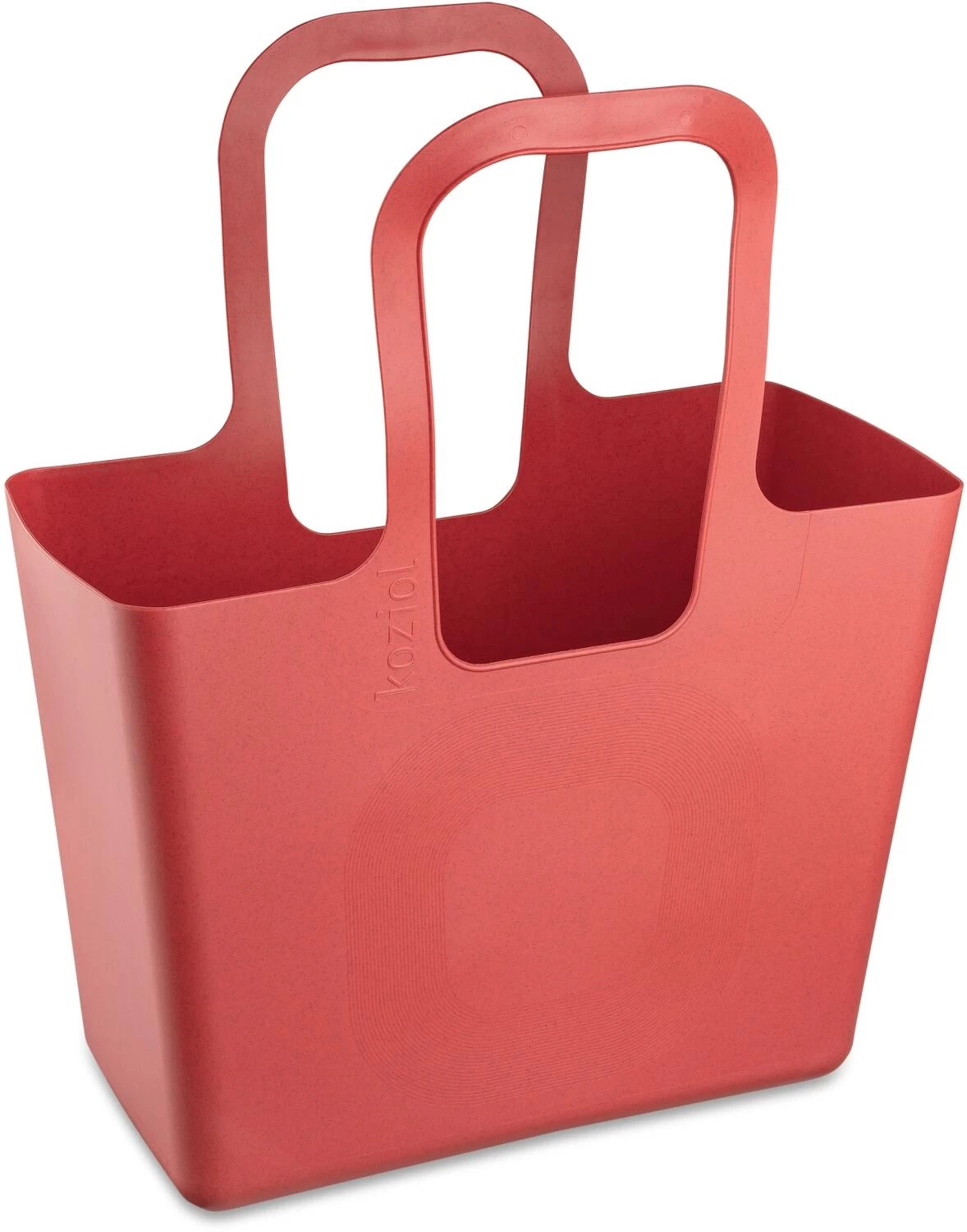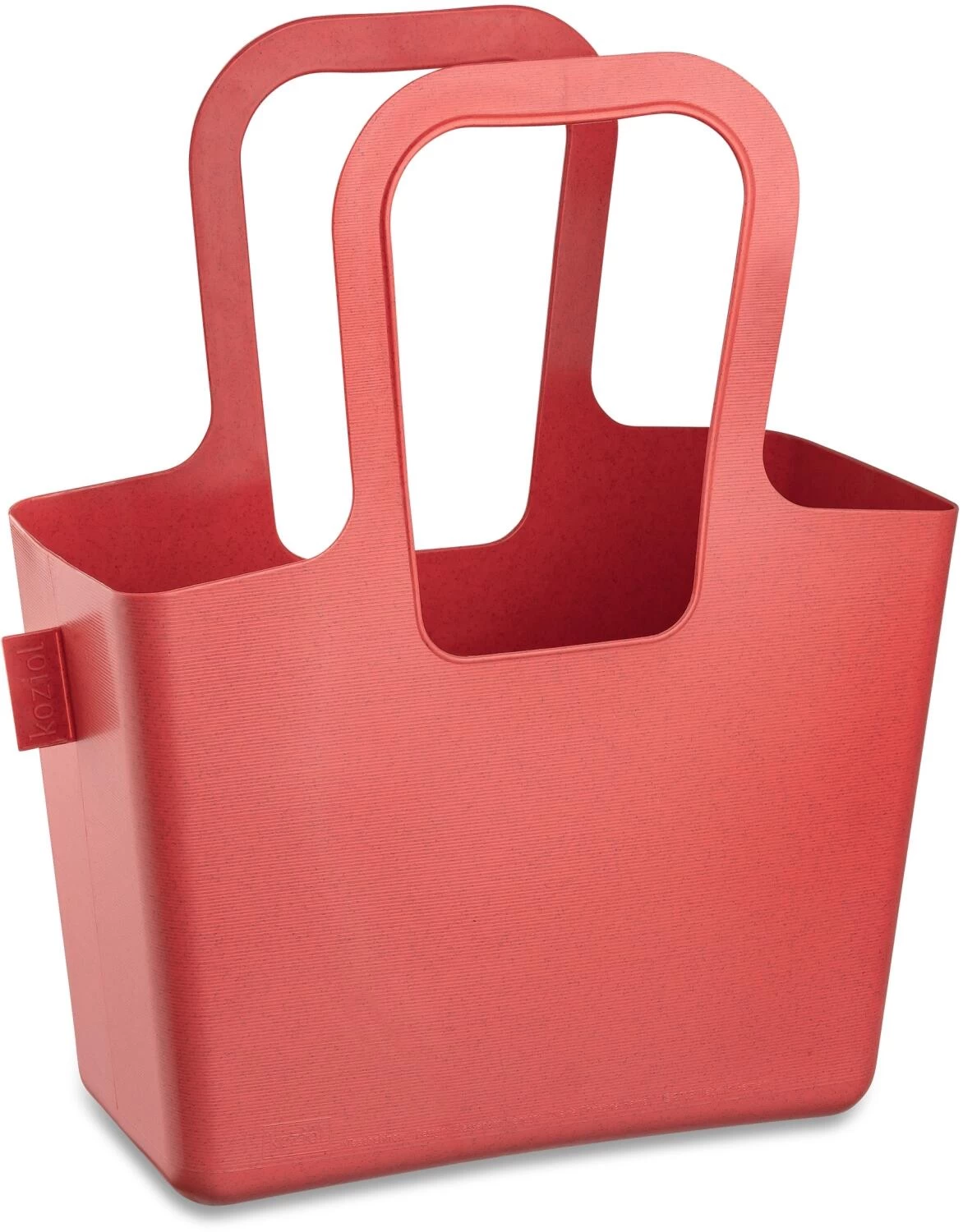 koziol Tasche aus recyceltem Kunststoff in coral. Die Tasche ist in 3 Größen erhältlich und praktisch zum Sammeln von Kleinigkeiten auf dem Schreibtisch, für Make-Up, Stifte, Zeitungen, zum Einkaufen oder für das nächste Picknick.