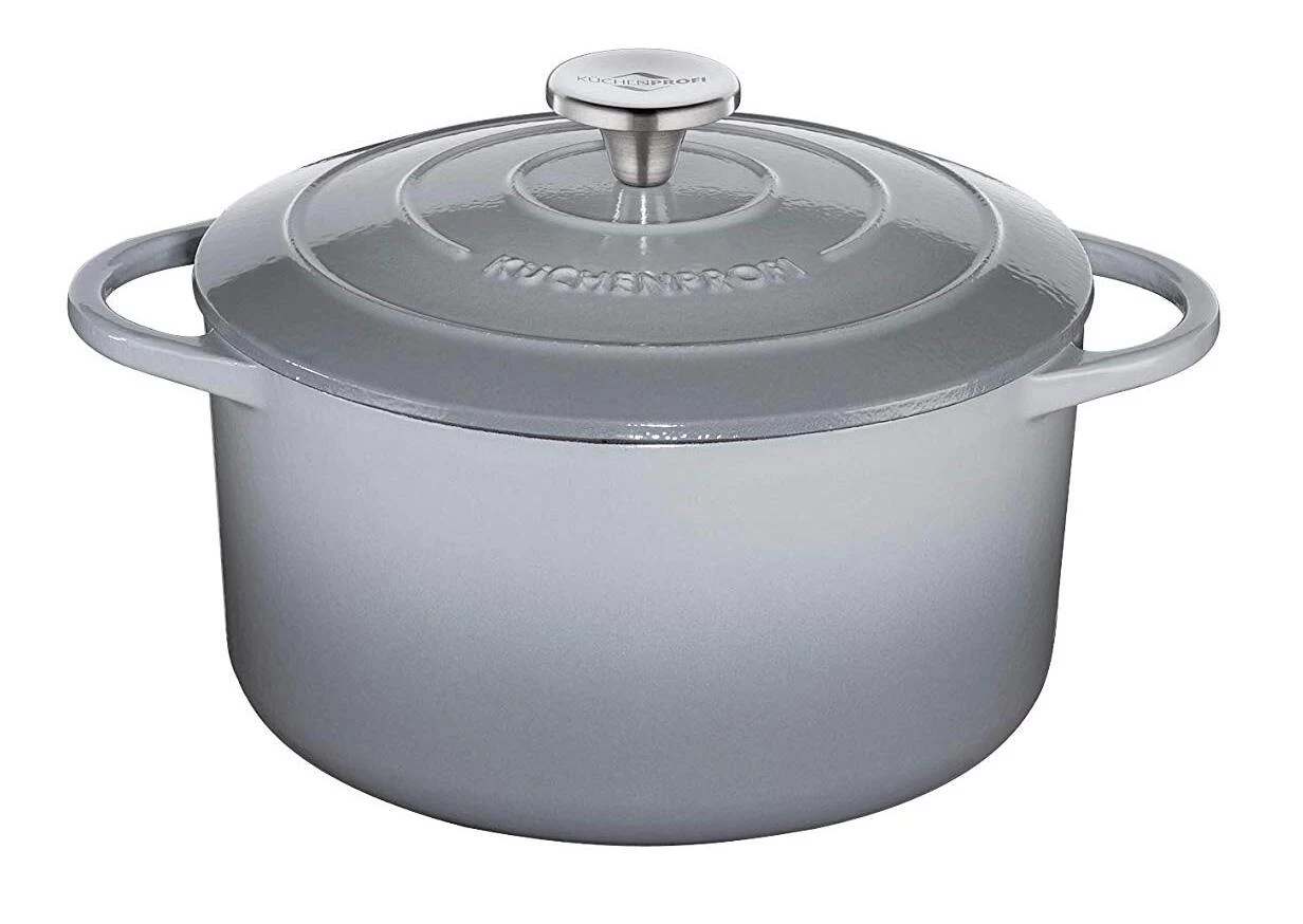 Küchenprofi Bratentopf rund aus Gusseisen Provence in grau. Der induktionsgeeignete Bratentopf mit ergonomisch geformten Griffen, die bis zu 250°C hitzebeständig sind.
