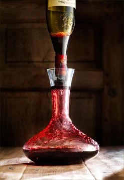 Setzen Sie die Weinflasche einfach auf den Vitesse-Dekanter und lassen Sie den Wein in die Karaffe fließen. Sie müssen die Flasche dabei nicht festhalten. Servieren Sie den Wein dann stilvoll aus der Karaffe. Platziert in der Tischmitte ist der Dekanter ein schöner Hingucker, während Sie Ihren Wein genießen.