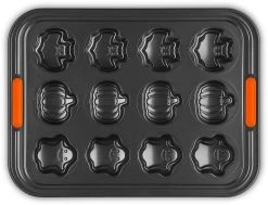 Le Creuset Halloween-Backform, 12er. Die Backform ist mit einer exzellenten Antihaftbeschichtung ausgestattet und enthält 12 Kammern zum Backen köstlicher Muffins oder anderer Küchlein in Kürbis-, Gespenst- oder Fledermaus-Form.