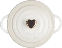 Le Creuset Mini Cocotte mit Herzknopf in meringue. Vielfältig einsetzbares Serviertöpfchen aus Steinzeug mit liebevollem, goldenem Detail im Deckelknauf.