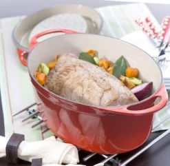 Le Creuset Saftbräter Doufeu oval aus Gusseisen in kirschrot. Der le Creuset Doufeu ist ein spezieller Schmortopf für saftiges Fleisch, vollen Geschmack und besonders schonende Zubereitung. Der Name des Bräters ist Programm: „feu doux“ bedeutet im Französischen sanftes Feuern oder kleine Hitze. Der Schmortopf arbeitet nicht mit viel Power sondern auf die sensible Art.