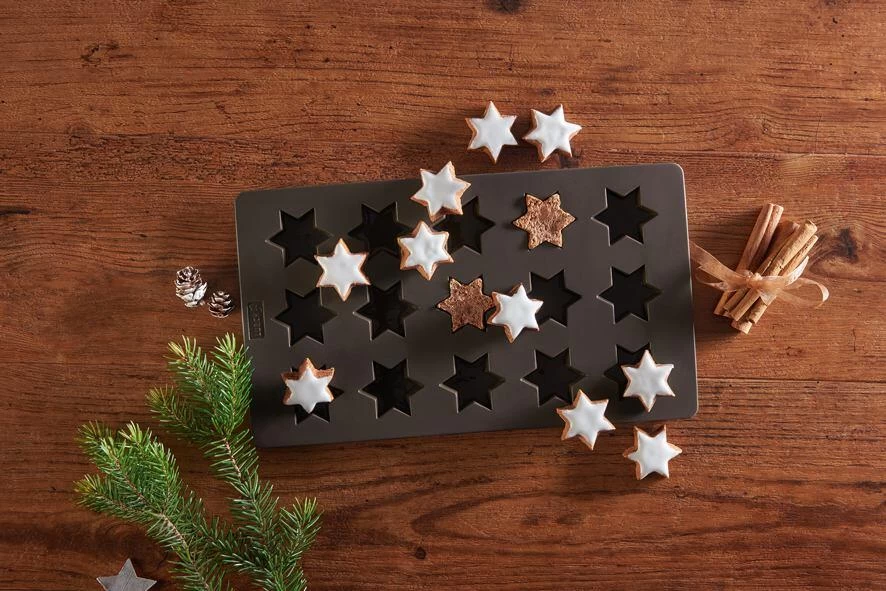 Die Sterne lassen sich rückstandslos aus der Backform entfernen. Das Material aus 100 % Platin-Silikon ist von -40 °C bis 240 °C temperaturbeständig. Neben weihnachtlichen Zimtsternen können Sie auch individuelle Eiswürfel damit herstellen. Das Material ist geschmacksneutral, lebensmittelecht und zeichnet sich durch maximale Antihaftwirkung aus. Das Gebäck lässt sich ganz einfach aus der Form von Lurch lösen, so dass kein Teil zerbricht.