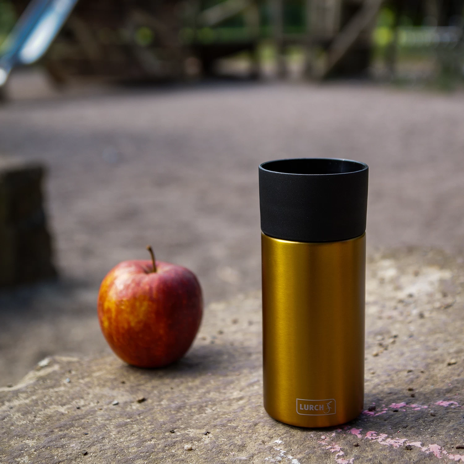 Mit dem Lurch Isolier-Becher in columbia gold aus doppelwandigem Edelstahl blieben Kaffee und andere Getränke lange heiß und frisch! Der Becher eignet sich dank patentiertem Einhandverschluss mit 360° Schnellöffnung ideal für den Kaffeegenuss im Auto. Selbstverständlich eignet sich der Thermobecher für alle gängigen Getränkehalter. Nach der Nutzung empfiehlt sich eine Reinigung per Hand, das schont die Lackierung des Bechers und ist dank der großen Öffnung unkompliziert.