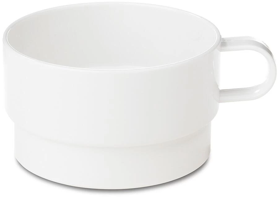 Weiße Cappuccinotasse mit einem Inhalt von 300 ml aus der Basic (Camping-)Geschirr-Serie. Dieses Campingservice besteht schon länger als 30 Jahre und ist inzwischen ein echter Klassiker geworden.