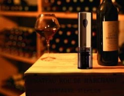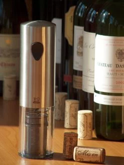 Korkenzieher Elis. Erlaubt das Öffnen einer Weinflasche ohne jede Anstrengung in wenigen Sekunden. Kann bei den verschiedensten Flaschenhälsen und bei allen Korkenmaterialien eingesetzt werden. Die aufladbaren Batterien sind sehr sparsam und somit besonders umweltfreundlich.