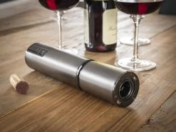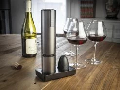 Erleichtert das Öffnen beliebiger Flaschenhälse und Kronkorkenmaterialien und das in Sekundenschnelle. Die auffällige Carbonoptik macht den Korkenzieher zusätzlich zum eleganten Hingucker. Einfaches Öffnen der Weinflaschen durch Aufsetzen des Geräts. Per Knopfdruck wird der entfernte Korken wieder ausgeworfen. Bis zu 80 Flaschen können durch den kraftvollen und aufladbaren Korkenzieher leise entkorkt werden. Dank Lithium-Ionen-Akku wird der Korkenzieher per Schnellladefunktion in 2,5 Stunden vollständig aufgeladen. Die Geschenkbox enthält eine Ladestation mit LED-Ladeanzeige für einen stets einsatzbereiten Korkenzieher sowie einen Kapselschneider. Ein Muss für den exklusiven Weingenuss!