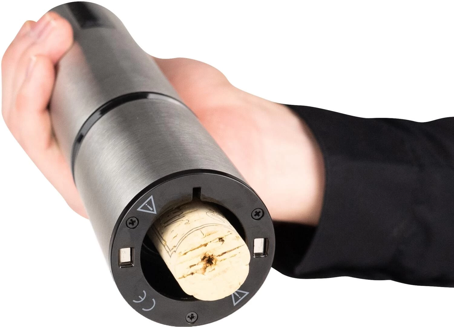 Erleichtert das Öffnen beliebiger Flaschenhälse und Kronkorkenmaterialien und das in Sekundenschnelle. Die auffällige Edelstahloptik macht den Korkenzieher zusätzlich zum eleganten Hingucker. Einfaches Öffnen der Weinflaschen durch Aufsetzen des Geräts. Per Knopfdruck wird der entfernte Korken wieder ausgeworfen. Bis zu 80 Flaschen können durch den kraftvollen und aufladbaren Korkenzieher leise entkorkt werden. Dank Lithium-Ionen-Akku wird der Korkenzieher per Schnellladefunktion in 2,5 Stunden vollständig aufgeladen. Die Geschenkbox enthält eine Ladestation mit LED-Ladeanzeige für einen stets einsatzbereiten Korkenzieher sowie einen Kapselschneider. Ein Muss für den exklusiven Weingenuss!