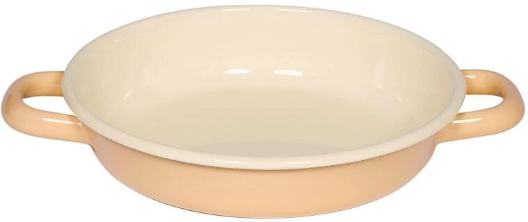 Riess Servierpfanne aus Emaille in goldgelb. Die Emaillepfanne mit 18 cm Durchmesser ist ideal für Omelett und andere Eiergerichte und ist für alle Herdarten sowie offenes Feuer und Backofen geeignet. Die Eierpfanne ist hitzebeständig bis 450 ° C, empfohlen wir eine Betriebstemperatur von 220 ° C.