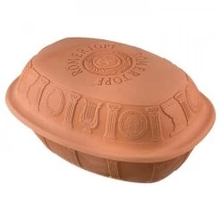 Römertopf Jubiläums-Bräter mittel. Das Modell für den Haushalt von 4-6 Personen bzw. einen Inhalt bis 6,0 kg. Gestaltet in traditionellem römischen Design, mit breitem Deckelrand zur einfachen und sicheren Handhabung. Mit Prägung „50 Jahre“. Der Markenname steht hier Pate für einen Bräter, der eigens zum Jubiläum der Marke RÖMERTOPF kreiert wurde. Gestaltet im typischen römischen Stil, mit Ehrenkranz und Jahreszahl, vermittelt dieser Jubiläums-Bräter eine einmalige Exklusivität und spiegelt den Inbegriff der römischen Kochkunst wieder.