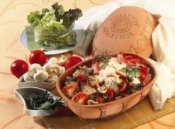 Durch die poröse Innenglasur im Unterteil lässt sich der Römertopf besonders gut reinigen und ist sogar für die Spülmaschine geeignet. Mit Gebrauchsanweisung und Rezeptvorschlägen.