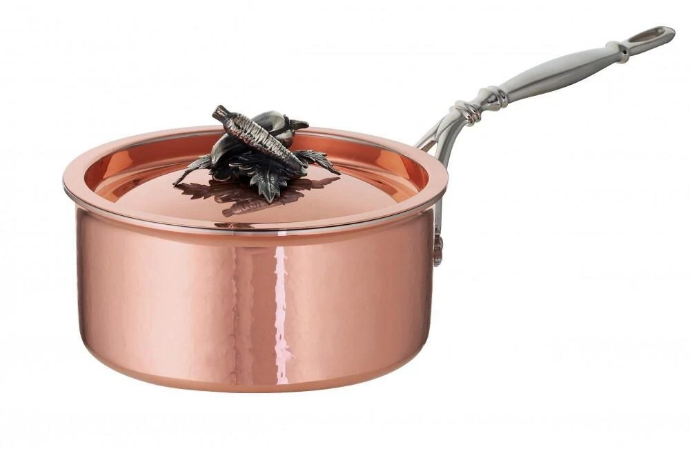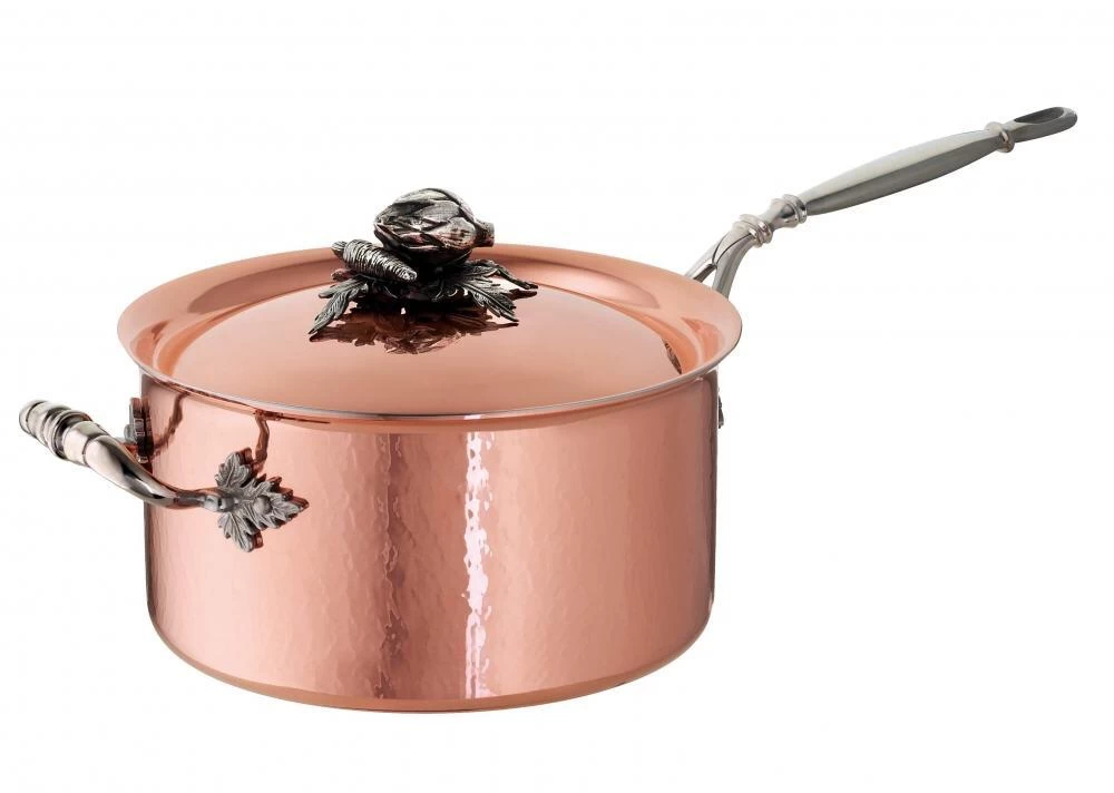 Ruffoni Stielkasserolle Opus Cupra mit Stiel und Deckel. Mit schönem Deckelmotiv aus Karotte und Paprika oder mit Karotte und Artischocke.