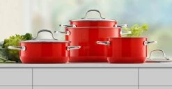 - Ganzmetallgriffe: Modern, ergonomisch, hitzeisolierend und absolut backofenfest. Entwickelt für eine sichere Handhabung