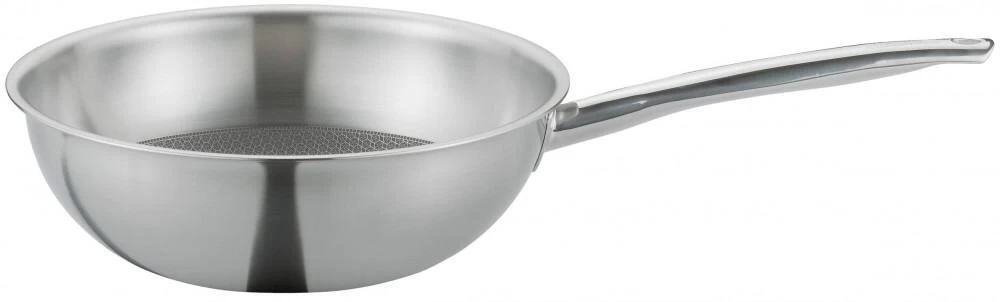 Spring Wokpfanne Vulcano Cut Resist Classic. Die Wokpfanne mit dem besonderen Schutzschild, der Cut Resist Beschichtung, ist stabil und sehr hart im Nehmen, was den Umgang von grobkantigen Pfannenwendern und ähnlichem auf ihr angeht.