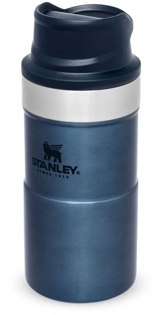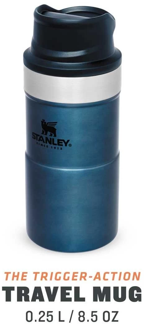 Mit der Slim Line Version des TRIGGER-ACTION TRAVEL MUG führt Stanley eine überarbeitete Version der einhändig bedienbaren Becher ein. Durch das neue, schlankere Design liegt der Becher noch angenehmer in der Hand und die 250ml-Variante passt unter die meisten Kaffee-Automaten. Das Drücken der großen und sehr leichtgängigen Taste zum Aktivieren der Trinköffnung mit einer Hand macht Trinken – on the go – zum Vergnügen. Der Trinkbecher in nightfall-blue aus rostfreiem 18/8-Edelstahl mit Vakuumisolierung besitzt ein Fassungsvermögen von 250 ml und hält Getränke bis zu 3 Stunden heiß oder 4 Stunden gekühlt. Der TRIGGER-ACTION TRAVEL MUG ist komplett spülmaschinenfest, auslaufsicher und passt in gängige PKW-Getränkehalter. BPA-frei.