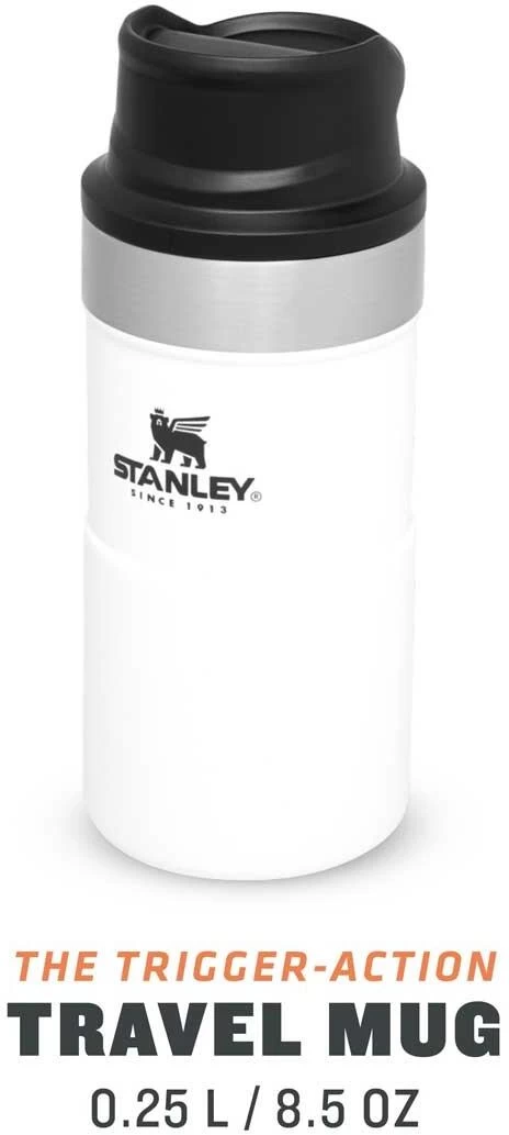 Mit der Slim Line Version des TRIGGER-ACTION TRAVEL MUG führt Stanley eine überarbeitete Version der einhändig bedienbaren Becher ein. Durch das neue, schlankere Design liegt der Becher noch angenehmer in der Hand und die 250ml-Variante passt unter die meisten Kaffee-Automaten. Das Drücken der großen und sehr leichtgängigen Taste zum Aktivieren der Trinköffnung mit einer Hand macht Trinken – on the go – zum Vergnügen. Der polarweisse Trinkbecher aus rostfreiem 18/8-Edelstahl mit Vakuumisolierung besitzt ein Fassungsvermögen von 250 ml und hält Getränke bis zu 3 Stunden heiß oder 4 Stunden gekühlt. Der TRIGGER-ACTION TRAVEL MUG ist komplett spülmaschinenfest, auslaufsicher und passt in gängige PKW-Getränkehalter. BPA-frei.