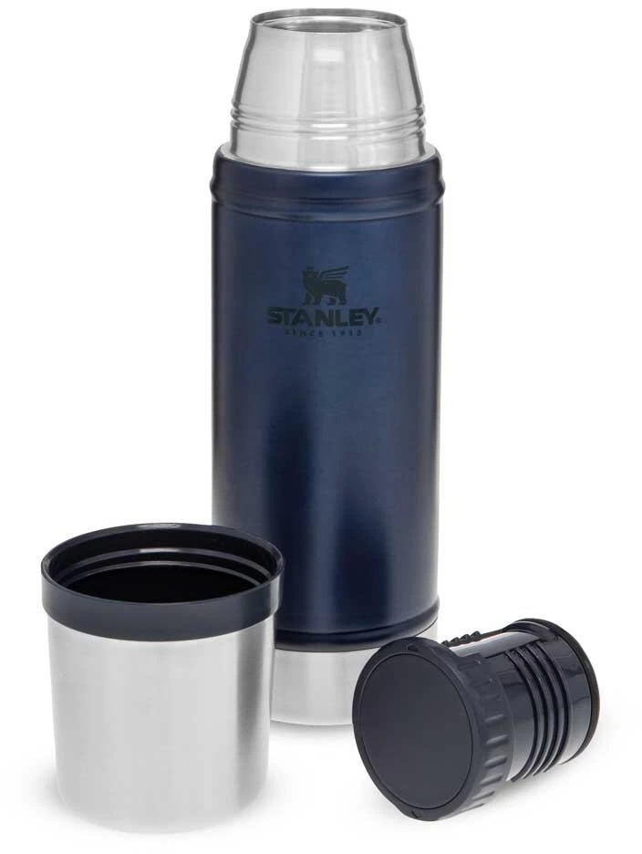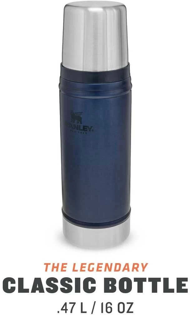Ideal für das Picknick. In der Stanley Classic Vakuum-Flasche aus rostfreiem Edelstahl kann man sowohl warme als auch kalte Getränke mitnehmen. Eine Doppelwand gewährleistet eine gute Isolation und hält die Flüssigkeit bis zu 15 Stunden kalt oder 15 Stunden heiß. Die Flasche weist eine 5 cm weite Öffnung auf und lässt sich so leicht reinigen. Praktisch ist der isolierte Deckel mit Gefäßfunktion. Das Gehäuse ist mit einer robusten Lackierung in Nightfall blau versehen. Fassungsvermögen 0,47 Liter.