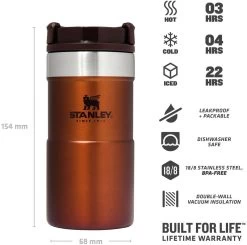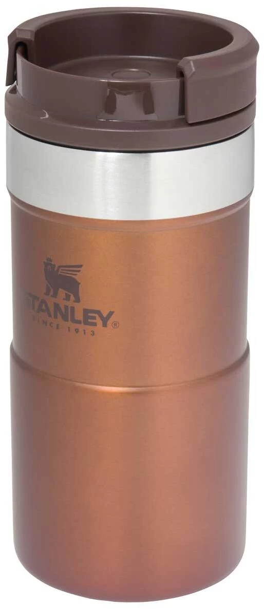 Mit dem Stanley NEVERLEAK TRAVEL MUG werden durch seine doppelwandige Edelstahl-Vakuumisolierung heiße Getränke bis zu 3 Stunden heiß und kalte Getränke bis zu 4 Stunden kalt gehalten. Der Trinkbecher aus rostfreiem 18/8-Edelstahl besitzt ein Fassungsvermögen von 250 ml und verfügt über einen einzigartigen 3-Positionen Deckel, der sich zum einfachen Trinken aufdrehen lässt und beim Schließen fest verriegelt. Der NEVERLEAK TRAVEL MUG ist komplett spülmaschinenfest, auslaufsicher und passt in gängige PKW-Getränkehalterungen. BPA-frei.