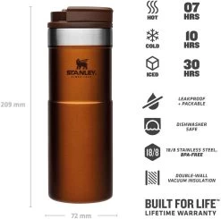 Mit dem Stanley NEVERLEAK TRAVEL MUG werden durch seine doppelwandige Edelstahl-Vakuumisolierung heiße Getränke bis zu 7 Stunden heiß und kalte Getränke bis zu 10 Stunden kalt gehalten. Der Trinkbecher aus rostfreiem 18/8-Edelstahl besitzt ein Fassungsvermögen von 473 ml und verfügt über einen einzigartigen 3-Positionen Deckel, der sich zum einfachen Trinken aufdrehen lässt und beim Schließen fest verriegelt. Der NEVERLEAK TRAVEL MUG ist komplett spülmaschinenfest, auslaufsicher und passt in gängige PKW-Getränkehalterungen. BPA-frei.