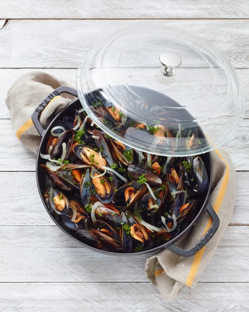 Der Bräter von Staub eignet sich gleichermaßen zum Braten und Schmoren und vereint die Vorteile von Gusseisen in einem. Da Gusseisen die Wärme speichert und gleichmäßig an die Gerichte weitergibt, ist ein schonenderes Garen auf niedrigster Stufe möglich. So erzielen Sie mit der Sauteuse besondere aromatische Geschmacksergebnisse von Fisch, Fleisch und Gämse.