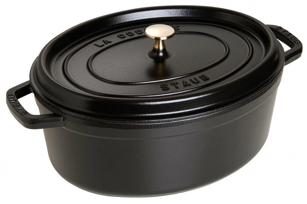 Eigenschaften des Staub Bräter bzw. Cocotte oval aus Gusseisen in schwarz:
