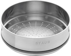 Der hochwertige Dämpfeinsatz aus Edelstahl 18/10 sorgt mit seinen zahlreichen auf der gesamten Fläche verteilten Öffnungen und der Silikon-Dichtung für einen optimalen Wärmekreislauf und einen gleichmäßigen Garprozess. Dampfgaren ist eine in Asien weit verbreitete Zubereitungsart. Die Lebensmittel werden dabei nicht mit direkter Hitze, sondern mit Dampf von Wasser oder Bouillon gegart. Der speziell für diese Anwendung gestaltete Staub Dämpfeinsatz gewährleistet ein schnelles und gleichmäßiges Garergebnis und sorgt dafür, dass Farbe und Geschmack der Zutaten erhalten bleiben.