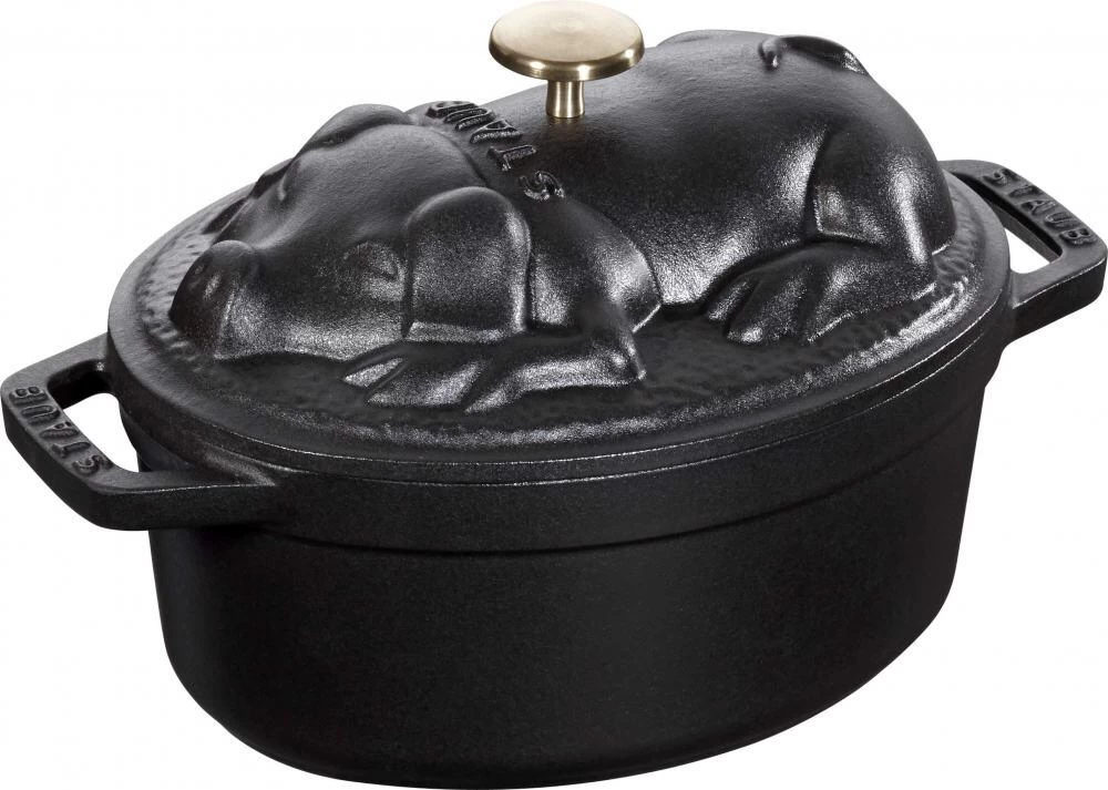 Eigenschaften des Staub Bräter bzw. Cocotte Schwein aus Gusseisen in schwarz:
