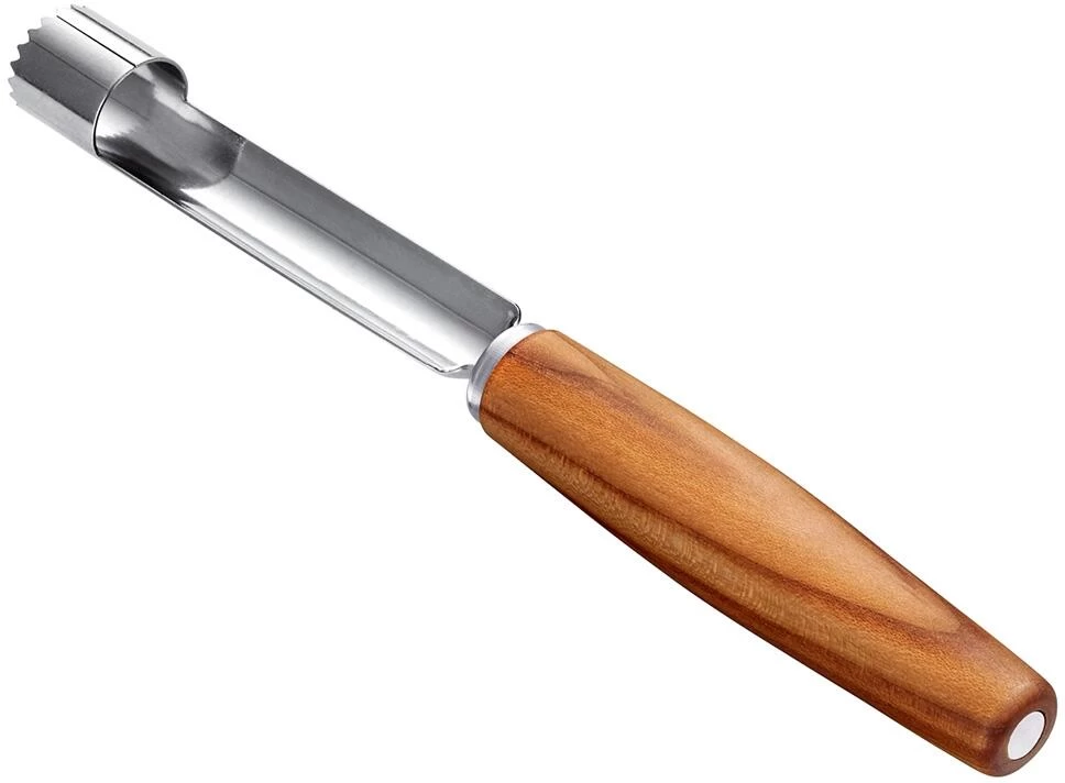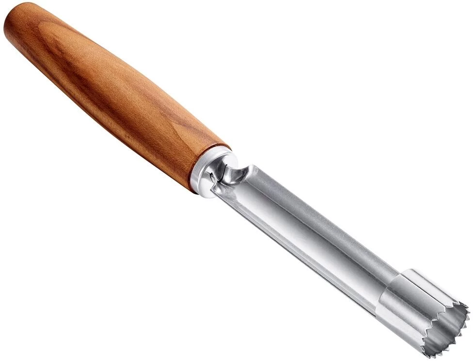 Der stabile Apfelentkerner entfernt Kerngehäuse in einem Zug. Mit 20mm Durchmesser ist er besonders für mittlere und große Äpfel geeignet. Für die Serie Sense verwendet triangle regionales Pflaumenholz und unterstützt damit eine nachhaltige Holzwirtschaft und kurze Transportwege. Die Griffe werden im Sauerland gedrechselt, anschließend in Solingen fein bearbeitet und mit Funktionsteilen aus Edelstahl konfektioniert. Gefertigt wird selbstverständlich mit Ökostrom. Hergestellt in Solingen/Deutschland.