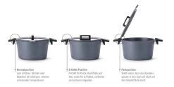 Der Silikoneinsatz ergänzt fünf weitere Funktionen und und macht concept plus zu einer einzigartigen und multifunktionalen Kochgeschirr-Serie aus gegossenem Aluminium.